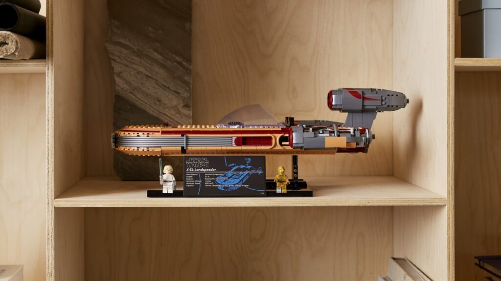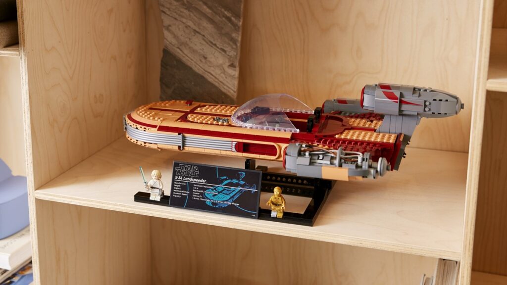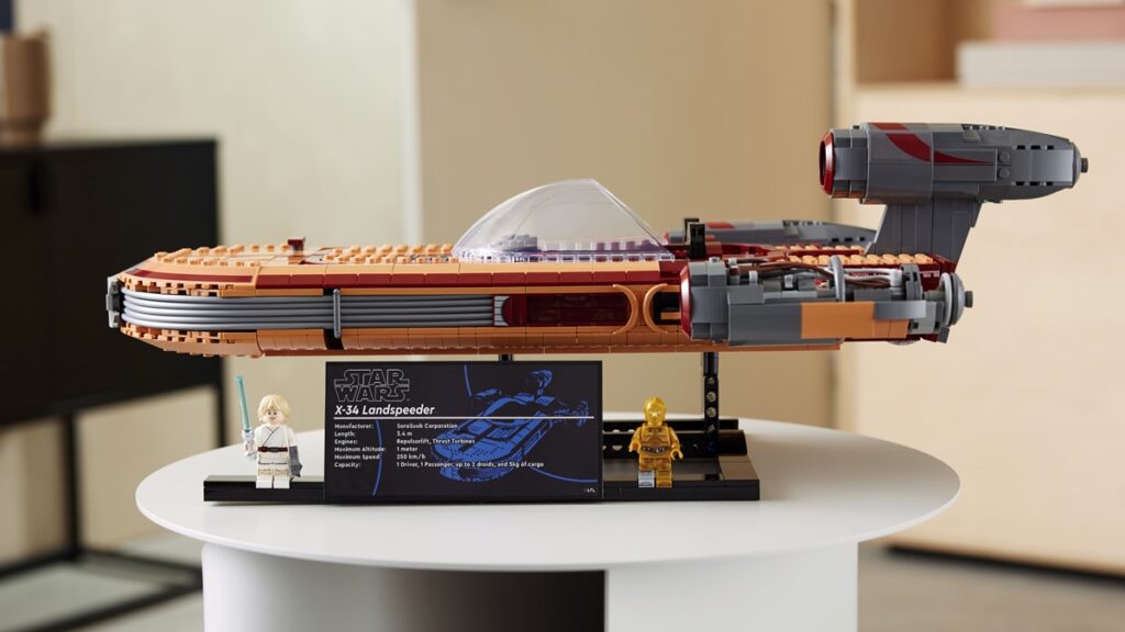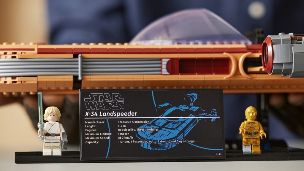 Składać się będzie z 1890 klocków, a jego rozmiary po wybudowaniu to: 50 cm długości, 30 cm szerokości i 17 cm wysokości. Na uwagę zwraca szeroka przednia szyba (12 studów). Zestaw ma dwumiejscowy kokpit, silnik turbinowy bez osłony, oraz ekskluzywną minifigurkę C-3PO i minifigurkę Luke’a z mieczem świetlnym. Do tego podstawka i tabliczka z danymi technicznymi śmigacza X-34.