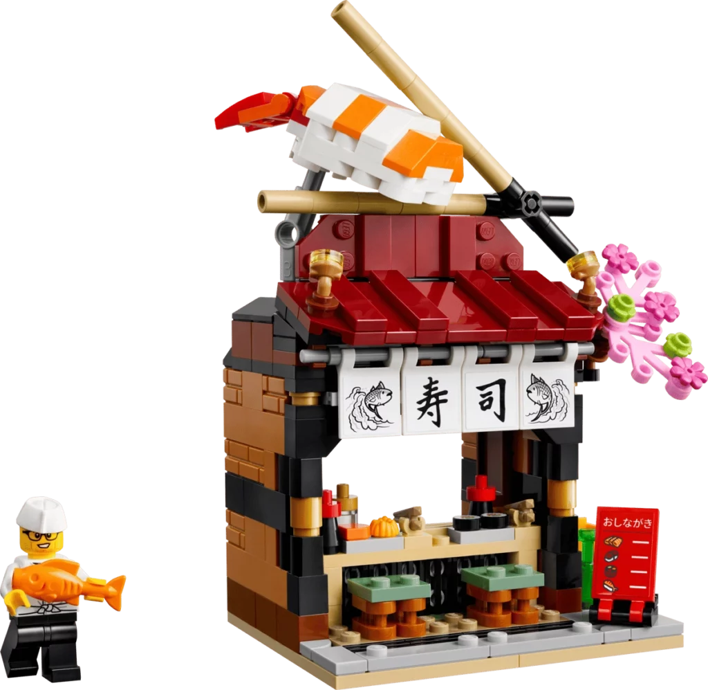- 27.02.-8.03. – LEGO 40906 Restauracje świata: Japonia – 289 el. – to model restauracji z japońskimi dekoracjami i kawałkiem sushi nigiri na dachu. Do tego mamy minifigurkę szefa kuchni. Otrzymamy go przy zakupach za ok. 750 zł. Wyceniony przez LEGO na 84,99 zł set powinien być wart ok. 100 zł.