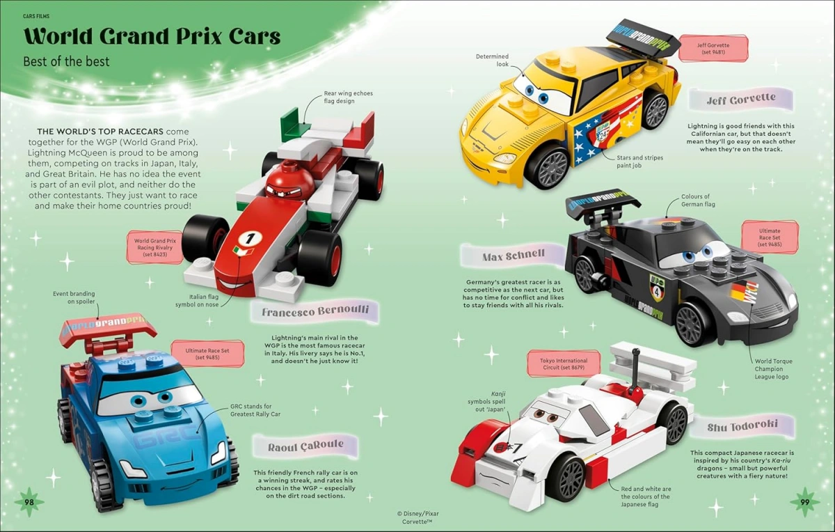 Książka przedstawia ponad 150 minifigurek i minilaleczek LEGO. Jak zwykle, każda z nich jest dokładnie opisana, włącznie z ciekawostkami. Wśród „postaci” są też te znane z serii „Cars”.