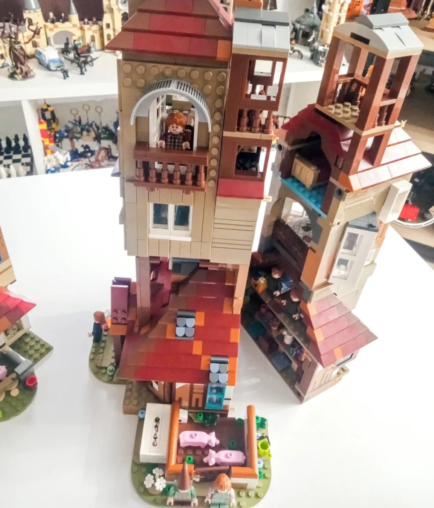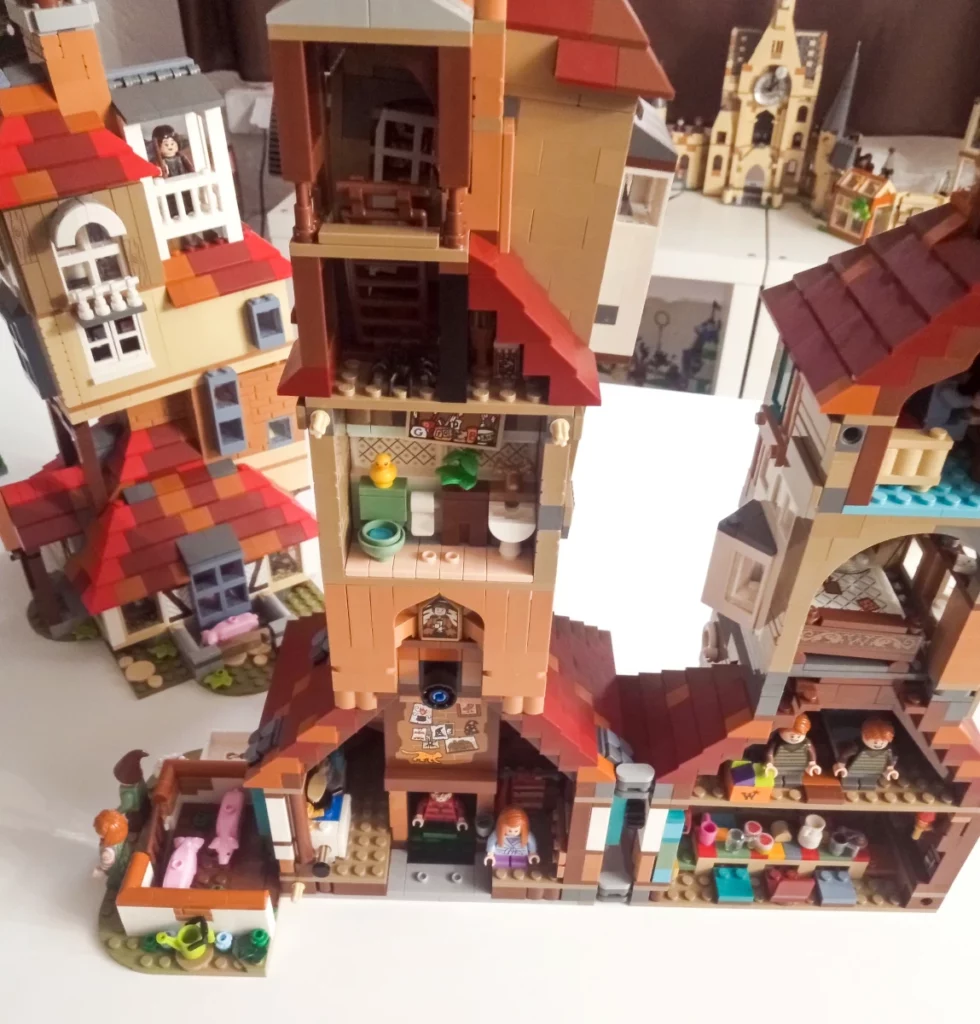 LEGO 76437 Nora – edycja kolekcjonerska to największy i najbardziej dopracowany z dotychczasowych budynków Weasleyów. Po raz pierwszy możemy znaleźć całą rodzinę w jednym zestawie. Choć rozstaw i położenie pokoi różni się jednak od książkowych opisów, (według których chociażby pokój Percy’ego znajdował się na tym samym piętrze co pokój bliźniaków) to liczba szczegółów, wyposażenia, zdobień może się podobać. W zestawie nie brakuje też dość dziwnych elementów: zabudowanego okna w pokoju rudzielca w pidżamie czy czerwonego kubka którego nijak nie da się wyciągnąć spod dachu. Wymagające skupienia i uwagi jest też precyzyjne umieszczenie naklejek, zwłaszcza tych transparentnych.
