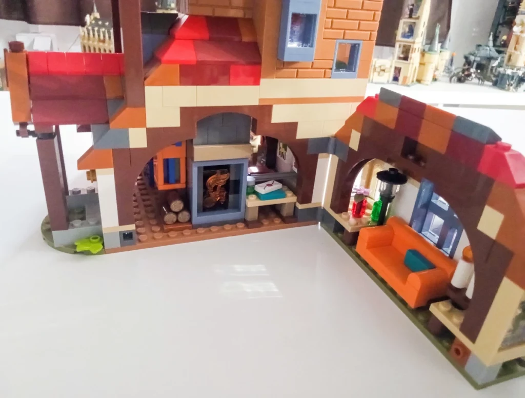 Kilka zdań warto poświęcić elementom bawialnym, ruchomym, które – nie ma co ukrywać – nie do końca moim zdaniem się udały. Kominek do podróży pomiędzy magicznymi lokacjami działa na tej samej zasadzie co w gratisowym zestawie LEGO 40695 Borgin & Burkes: sieć Fiuu. Z jednej strony warto więc pochwalić za pierwsze w historii rozwiązanie pozwalające umieszczać minifigurki w środku budynku i je „poruszać”, a z drugiej – nieco zganić: za duże czarne elementy mające imitować ścianę komina, na których nie ma żadnej naklejki, nadruku, wzoru – po prostu po otwarciu drzwi wpadamy na czarną ścianę (w wersji z 2020 roku kominek, choć sporo mniejszy, został ciekawie obudowany małymi konstrukcjami).