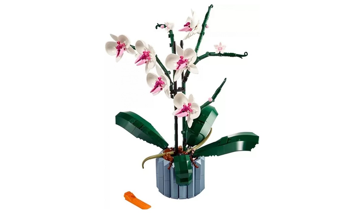 Inspirowany prawdziwymi orchideami model ma pięć liści u podstawy oraz dwa ruchome korzenie powietrzne, które nadają roślinie realistyczny wygląd. Niebieski żłobkowany wazon złożony z klocków można wypełnić brązowymi elementami imitującymi podłoże z kory, w którym rosną prawdziwe orchidee.