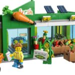 W zestawie mamy zarówno świetny sklep z masą warzyw, jak wózek na zakupy, samochód osobowy, wózek widłowy, pojemnik recyklingowy oraz pięć minifigurek, z których jedna jest reklamówką warzywniaka i jest przebrana za fasolę.
