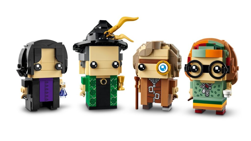 W zestawie mamy aż cztery postaci. Wszystkie oczywiście “w kwadracie”. Mimo to autentyczne detale pozwalają je rozpoznać: profesor Snape nosi czarną pelerynę, profesor McGonagall ma zieloną sukienkę, kapelusz wiedźmy i złote pióra, profesor Moody ma cudowne oko, a profesor Trelawny nosi kolorową opaskę na głowę. Po zbudowaniu każda z postaci ma nieco ponad 8 cm wysokości.