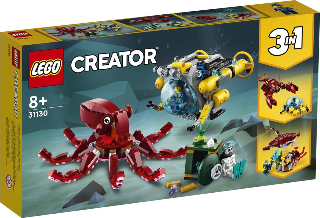 W podstawowej wersji mamy batyskaf, skarb (sejf) i ośmiornicę. Zestaw można przebudować na mniejszy batyskaf i wielkiego homara oraz w wielką płaszczkę. W pudełku znajdziecie też minifigurkę nurka oraz szkielet.