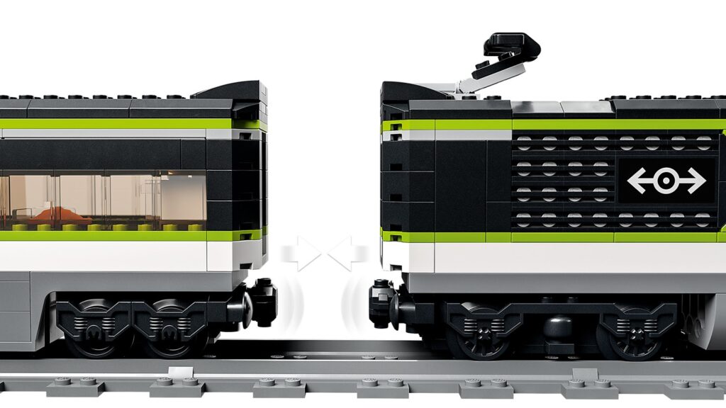 Nowy pociąg pasażerski składa się z elektrowozu i dwóch wagonów (łączna długość 86 cm). W zestawie mamy także sześć minifigurek, małą platformę i 24 szyny (8 prostych i 16 zakrzywionych). Pociąg jest zasilany przez system LEGO Powered Up.