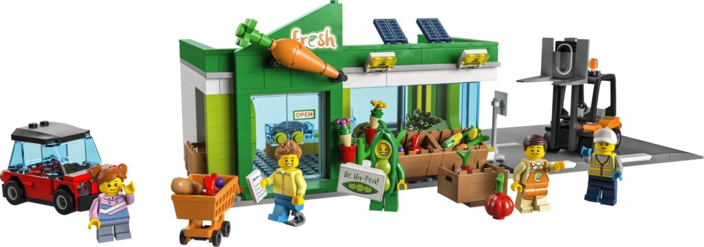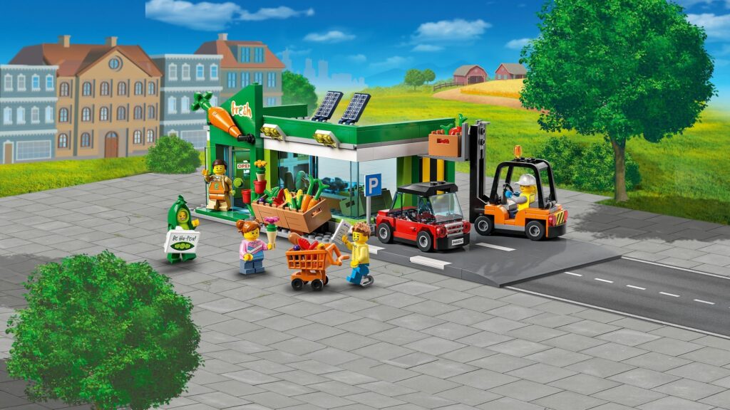 W zestawie mamy zarówno świetny sklep z masą warzyw, jak wózek na zakupy, samochód osobowy, wózek widłowy, pojemnik recyklingowy oraz pięć minifigurek, z których jedna jest reklamówką warzywniaka i jest przebrana za fasolę.