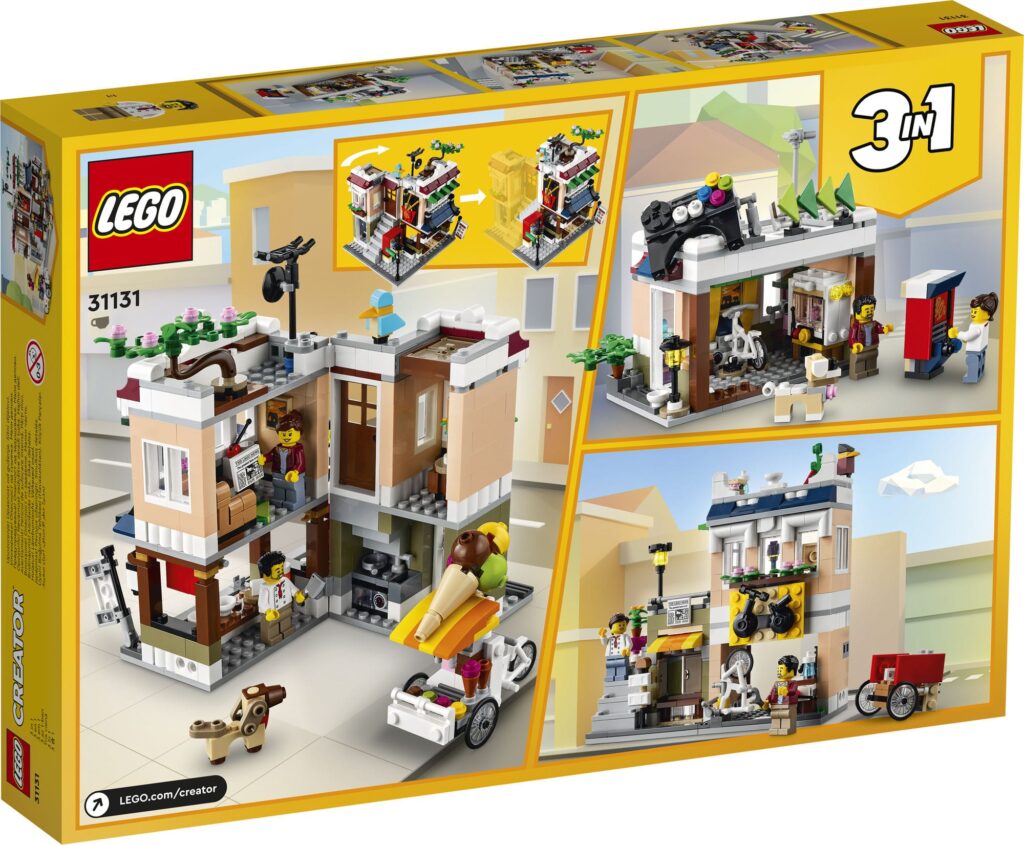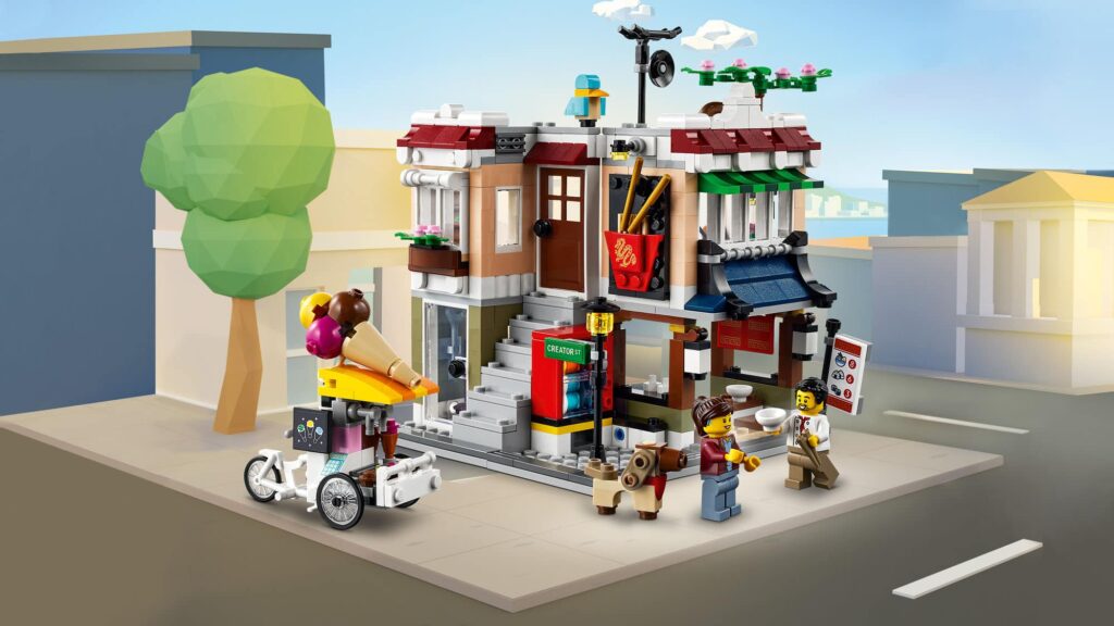 Na dole budynku jest lokal serwujący kluski, a nad nim znajduje się mieszkanie z tarasem na dachu. Obok stoi wózek z lodami. W zestawie są dwie minifigurki oraz pies z klocków. Set można przebudować w sklep rowerowy, stoisko z gazetami i studio artystyczne na piętrze. Ten modyfikowalny zestaw 3 w 1 sprawia, że zabawa nigdy się nie kończy.