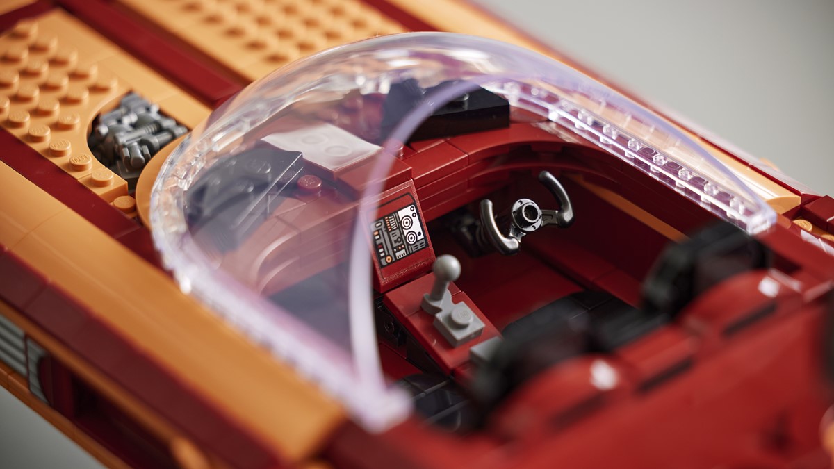 Składać się będzie z 1890 klocków, a jego rozmiary po wybudowaniu to: 50 cm długości, 30 cm szerokości i 17 cm wysokości. Na uwagę zwraca szeroka przednia szyba (12 studów). Zestaw ma dwumiejscowy kokpit, silnik turbinowy bez osłony, oraz ekskluzywną minifigurkę C-3PO i minifigurkę Luke’a z mieczem świetlnym. Do tego podstawka i tabliczka z danymi technicznymi śmigacza X-34.