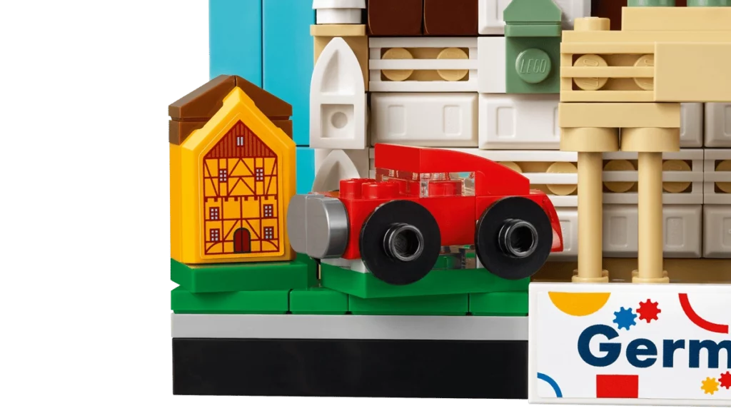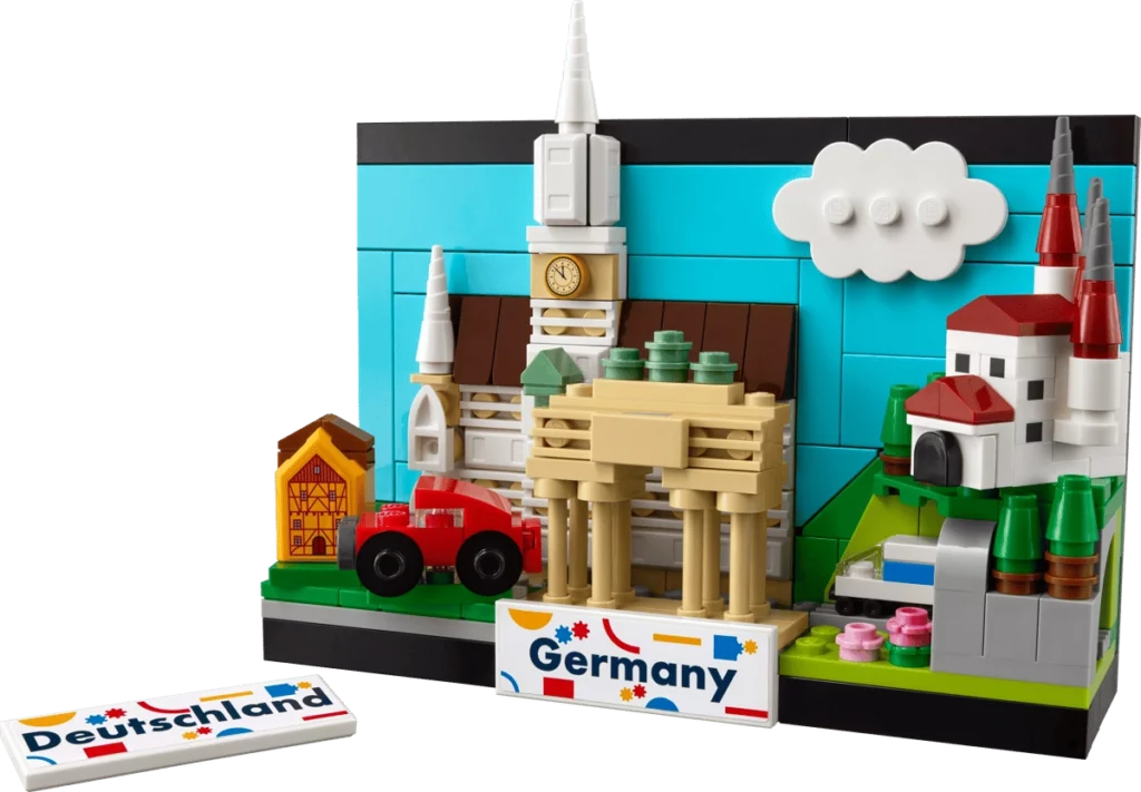 - [NOWE] LEGO 40954 Pocztówka z Niemiec (62,99 zł) – 240 elementów – na pocztówce są: Nowy Ratusz w Monachium, Brama Brandenburska i zamek, a także samochód i pociąg oraz naklejki z napisami „Germany” i „Deutschland”.
