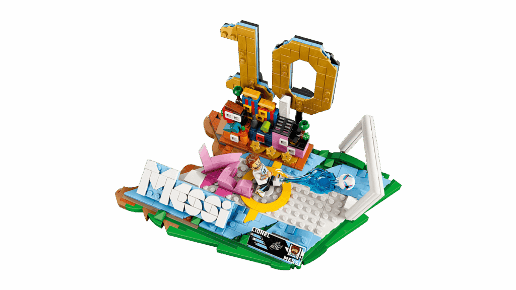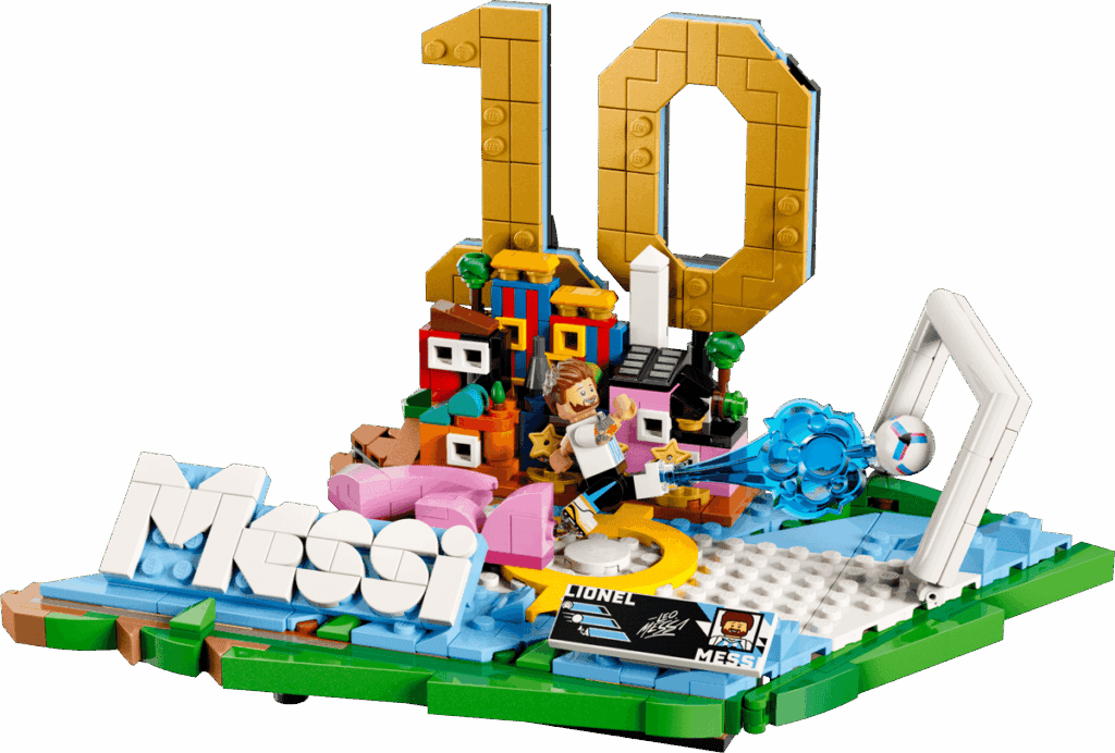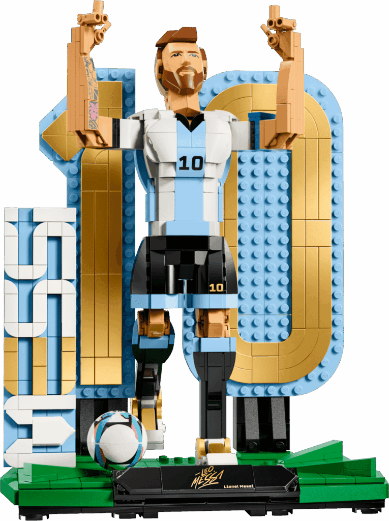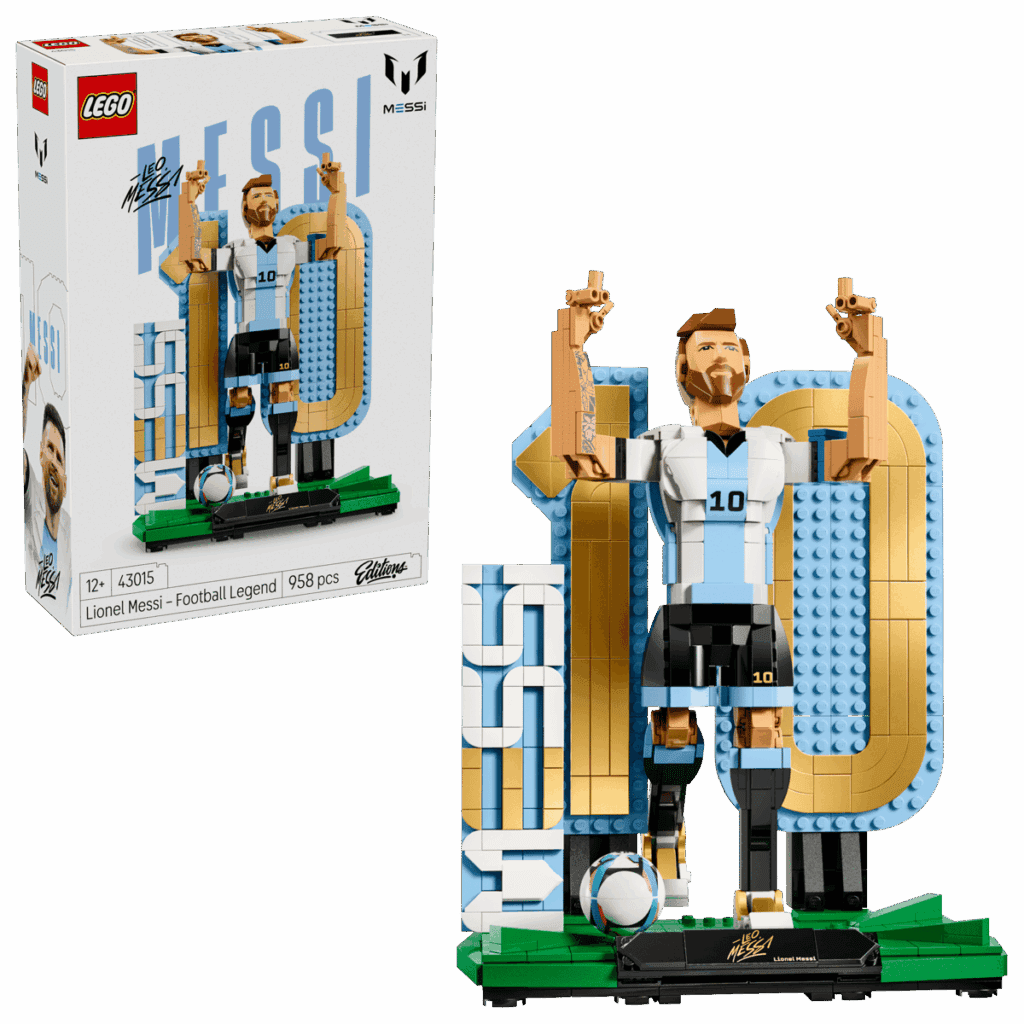 - LEGO 43015 Lionel Messi – piłkarska legenda (339,99 zł) – 958 elementów – postać piłkarz stoi na tle liczby 10. Model ma 27 cm wysokości, 21 cm szerokości i 14 cm głębokości.