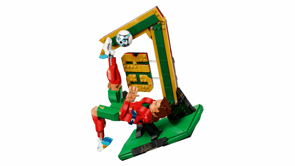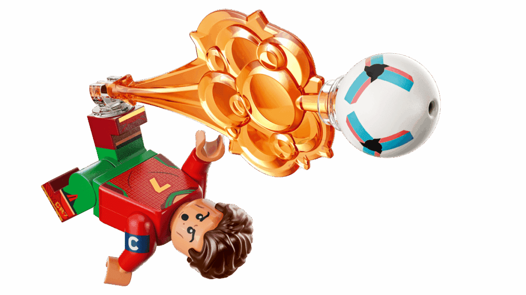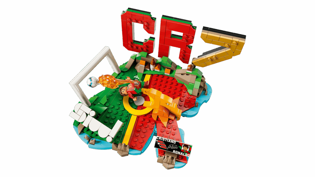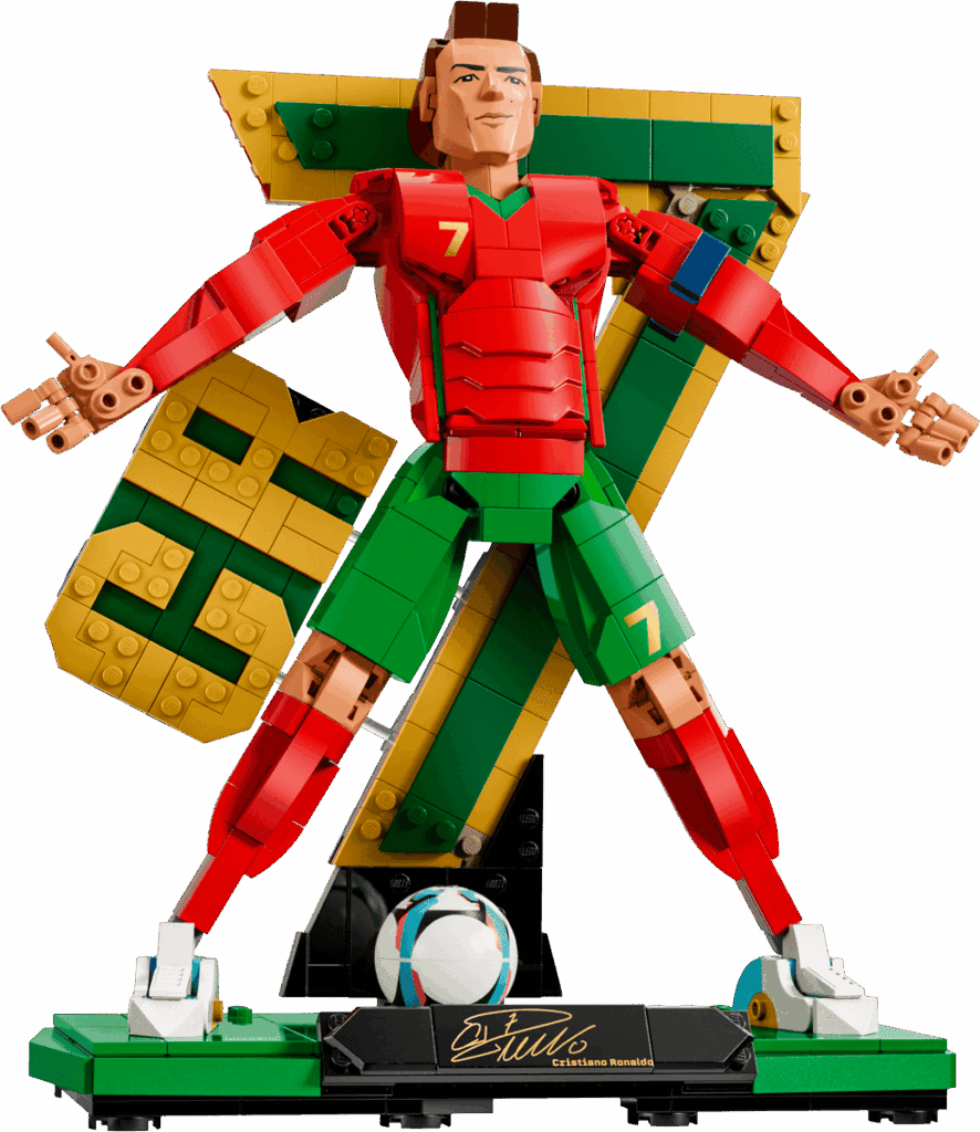 - LEGO 43016 Cristiano Ronaldo – piłkarska legenda (339,99 zł) – 854 elementy – postać piłkarz stoi na tle cyfry 7. Model ma 25 cm wysokości, 23 cm szerokości i 13 cm głębokości.