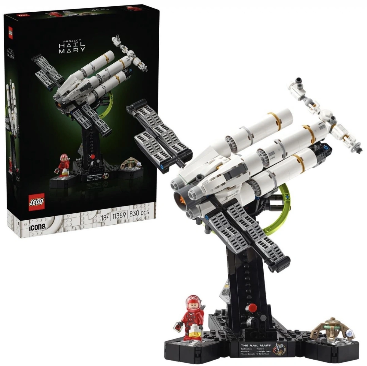 • LEGO 11389 Projekt Hail Mary (479,99 zł) – 826 elementów – zestaw na podstawie filmu o tym tytule. Statek łącznie z podstawką do ekspozycji ma 30 cm wysokości, 25 cm długości i 22 cm szerokości. Podstawka jest ruchoma, dzięki czemu model można ustawiać pod różnym kątem. W zestawie są minifigurka Rylanda Grace’a i figurka kosmity Rocky’ego.
