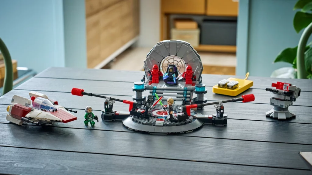 - LEGO 75427 SMART Play: Pojedynek w sali tronowej i A-Wing (699,99 zł) – 962 elementy – trzy minifigurki Smart przedstawiające Luke’a Skywalkera, Imperatora Palpatine’a oraz Dartha Vadera. Klocek Smart oraz 5 tagów Smart wykorzystywanych do „ożywienia” myśliwca A-wing, tronu, wieżyczki Gwiazdy Śmierci oraz pojedynku na miecze świetlne. Zestaw ma 14 cm wysokości, 29 cm długości i 49 cm szerokości.